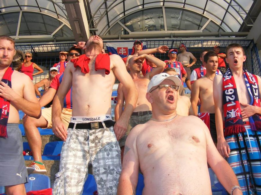 “Support v prvom polčase bol doprevádzaný jednoručkovými mávatkami v našej modrej a červenej farbe. Okrem únavy z cesty a alkoholu, sme museli bojovať aj s teplom, čo sa logicky odzrkadlilo aj na supporte. Po prvom góle sme však ožili a tempo fandenia sa stupňovalo,” zhodnotili Záhoraci prvý polčas. “Cez prestávku vypukla pravá slovenská oblievačka, policajti len nechápavo krútili hlavou a sbska (slovenské steroidné brojlere by pred nimi vzali nohy na ramená) nás s úsmevom tolerovala. Záchody sme každopádne vytopili. Bufet ponúkal iba čistú vodu za 1 euro, tak sa niektorí obetavci rozhodli presvedčiť miestneho predajcu, že „no pivo, no party“. Ten našťastie pochopil, tak spolu s vodou rozlieval aj pivo do jednodecových umelohmotných pohárikov,” pokračujú v reporte členovia Železnej únie.