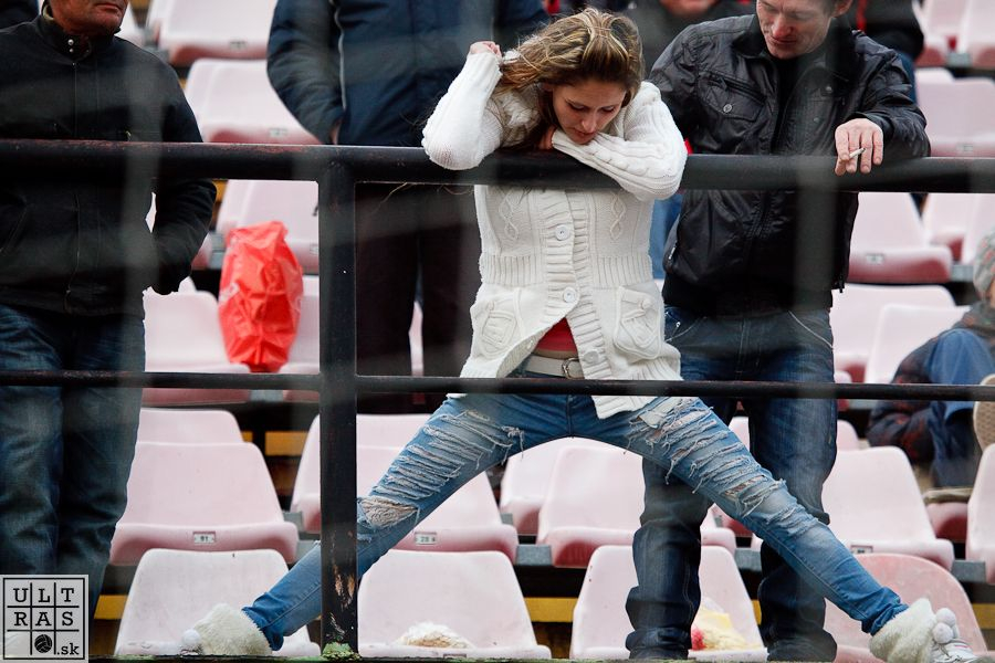 Výkony trnavských futbalistov počas jesennej časti nudili, na tribúnach zaujala aspoň táto “gymnastka.” Foto: Marián Bazala