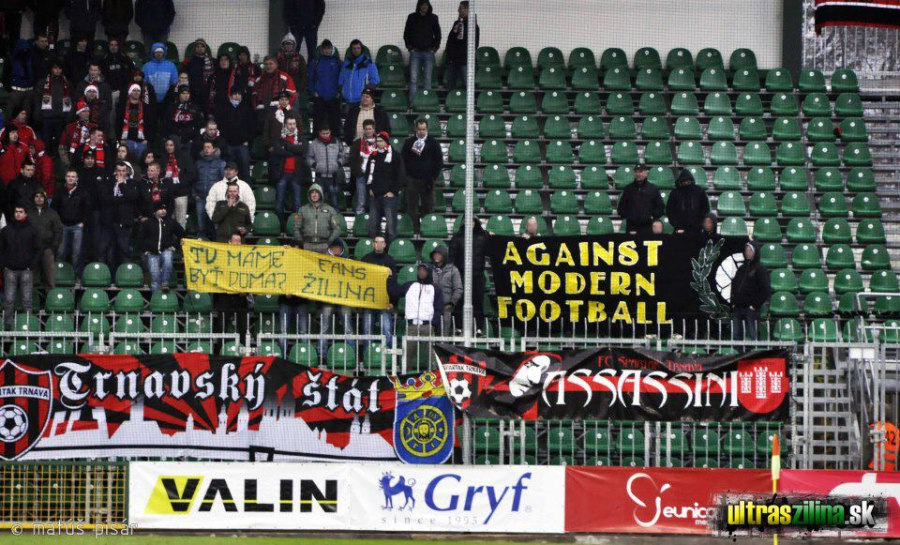 Na trnavské pomery neprišlo do Žiliny veľa fanúšikov, v sektore hostí sa ich zišlo zhruba 150. To im však bohato stačilo na to, aby boli ako doma. Viac však zaujalo ich gesto, keď pustili do svojho sektora Spartakovci nám vyšli v ústrety pri predaji lístkov, a tak sa na niekoľko minúť ocitla dvanástka Žilinčanov späť na Severe. Ku koncu prvého polčasu sme vytiahli symbolický transparent s textom ‘Tu máme byť doma?’ s podpisom ‘Fans Žilina.’ Nápis reagoval na smutnú skutočnosť, že žilinský fanúšik si musí zakúpiť lístok do sektoru hostí, aby mohol stáť na tribúne, ktorá bola dlhé roky domovom žilinského kotla. Bol doplnený o vlajku Against Modern Football a niekoľko pokrikov, medzi inými aj ‘vráťte sever fanúšikom.’ Následne sme poďakovali  Trnavákom a opustili sektor,” opísali situáciu na svojej stránke Žilinčania.