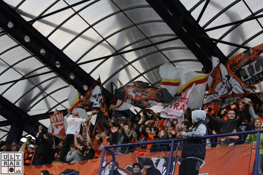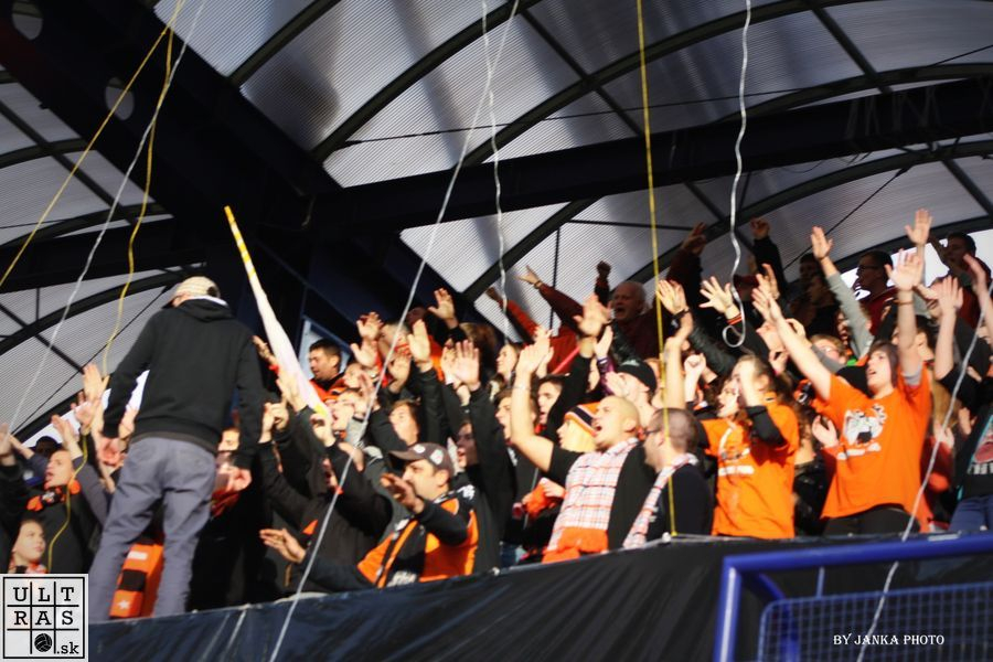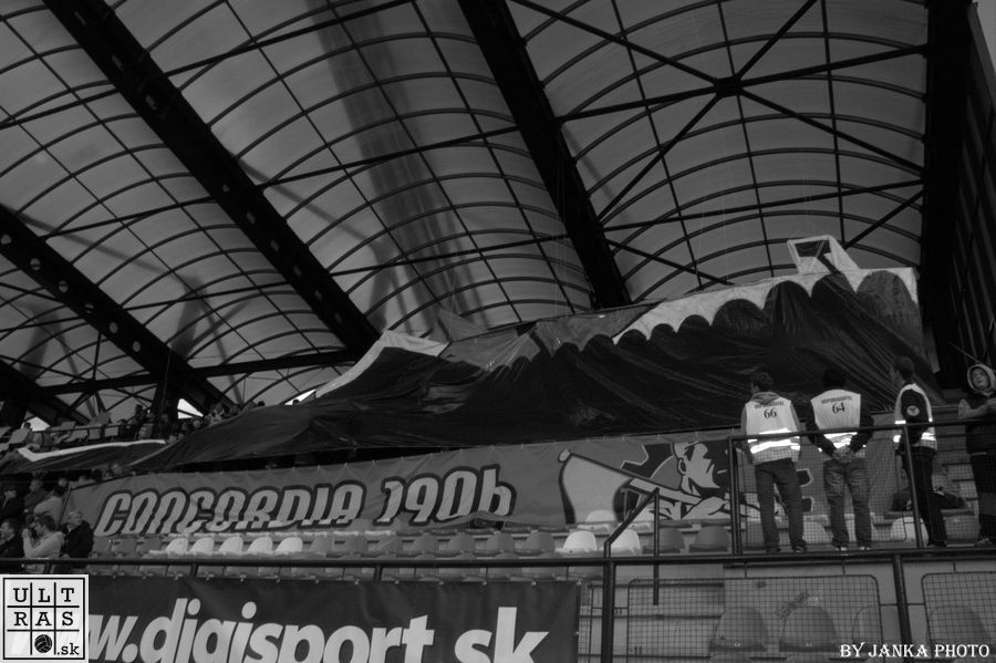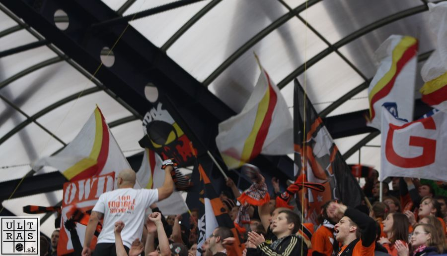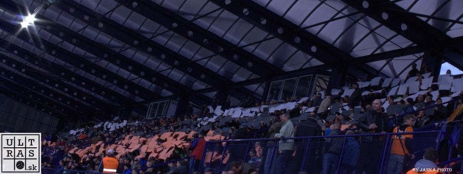 V sektore je nás natlačených zhruba 230, čiže toľko, koľko na poslednom zápase so Slovanom na jeseň 2012. (Kvalita supportu sa za ten rok poriadne zlepšila, aj keď je stále pre nami veľa, veľa roboty..) Na druhej strane v sektore hostí cca 90 belasých. Prvý polčas na trávniku prehrávame 2:0, no na tribúnach je to jednoznačnejšie, aj vďaka narvanému štadiónu je kulisa umocnená. V 60. minúte vyťahujeme druhú choreografiu v sektore – 200 bielych a oranžových fólií doplnených obojručkami 1906. Po Ďubekovej premenenej penalte sa nám podarí dotiahnuť na 2:3 a pri centroch do šestnástky posledných 10 minút je štadión doslova na nohách. Putnockého sieť sa sa však rozvlniť nepodarí, a tak sa šláger končí prehrou na trávniku.